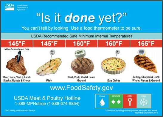 You can't tell just by looking! Use a food thermometer to be sure. For more information regarding the safe minimum internal temperatures recommended by the USDA, visit Foodsafety.gov