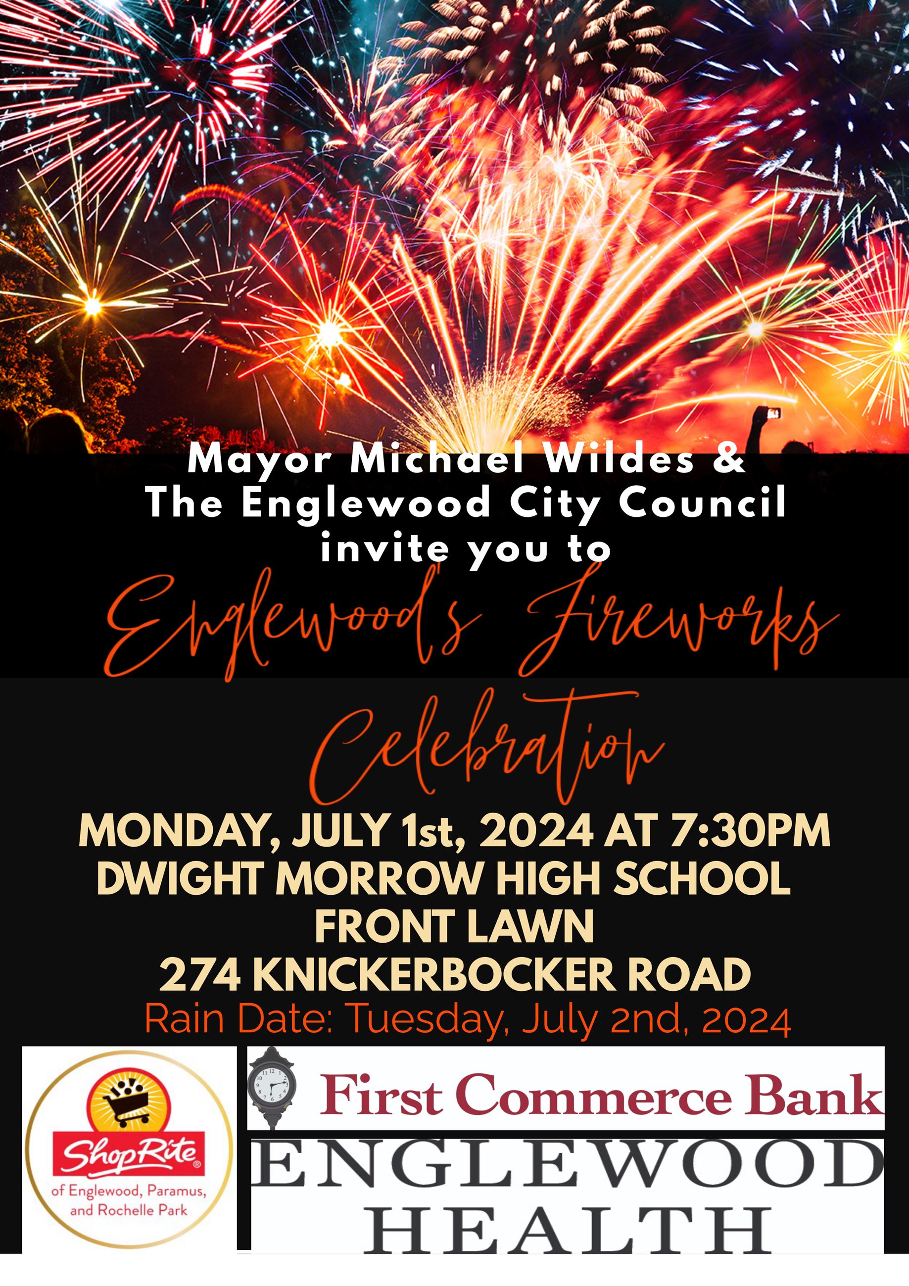 Mayor Michael Wildes & The Englewood City Council invite you to Englewood's Firework's Celebration on Monday, July 1st at 7:30pm, Dwight Morrow High School Front Lawn, 274 Knickerbocker Road Rain Date: Tuesday, July 2nd